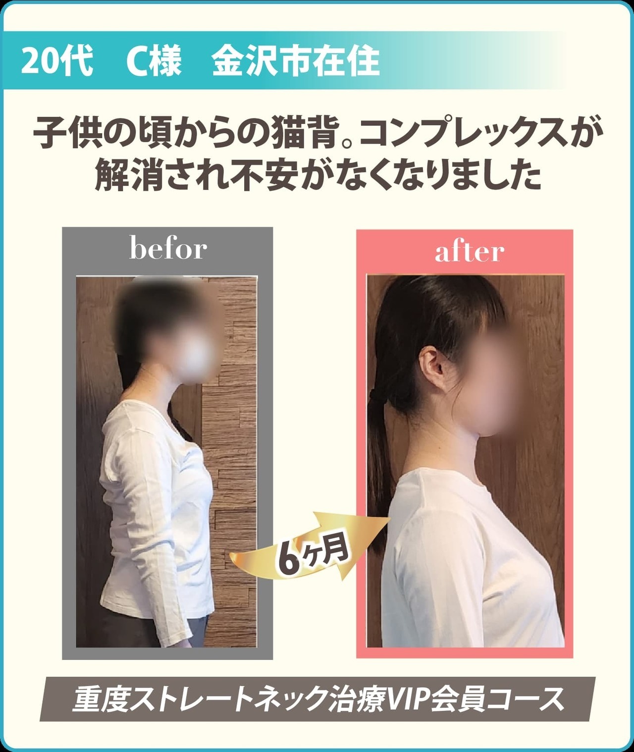 どこへ行っても治らなかったストレートネックが治り本当に感動しました。姿勢の分析をいただけるので納得して通う事が出来ています。