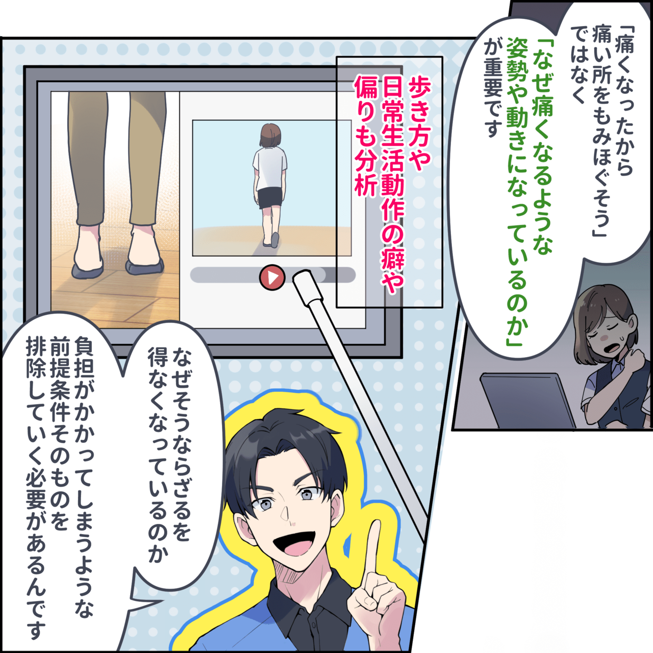 徒手検査・動的検査・歩行分析・AI姿勢分析などでお身体の状態を確認させていただき、施術方針を判断いたします。
