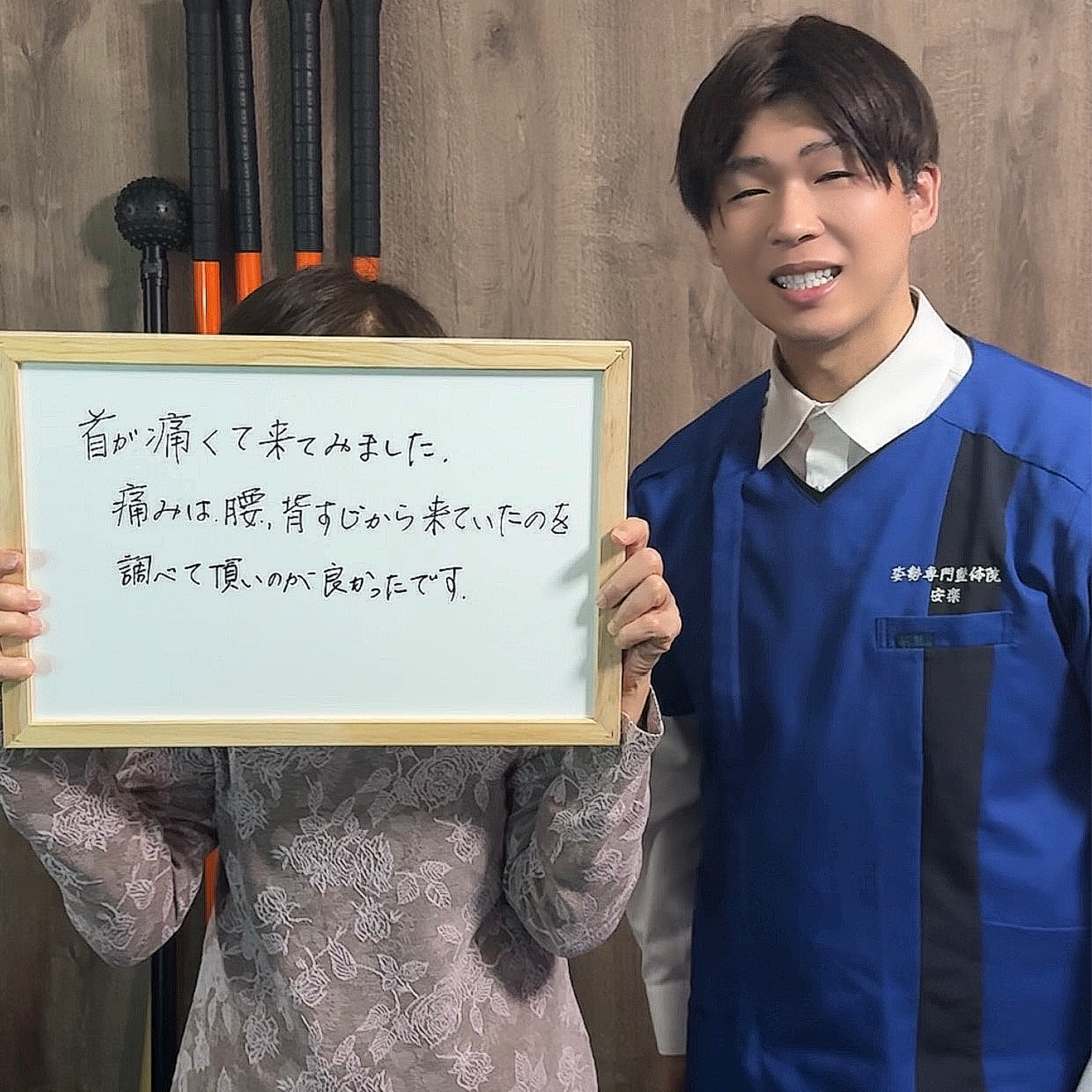 もう一つ気になっていたのが、首の付け根の違和感です。特に右に首を回す動作がきつく、無理やり左に回してグルグル動かして戻そうとすることもあったそうです。
