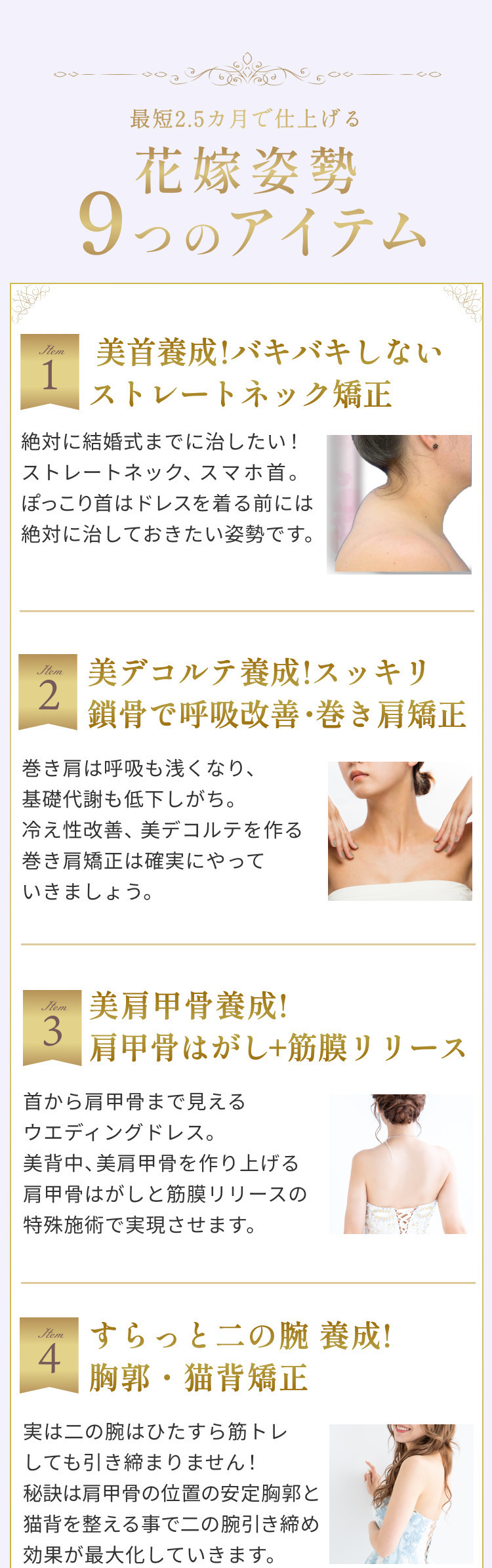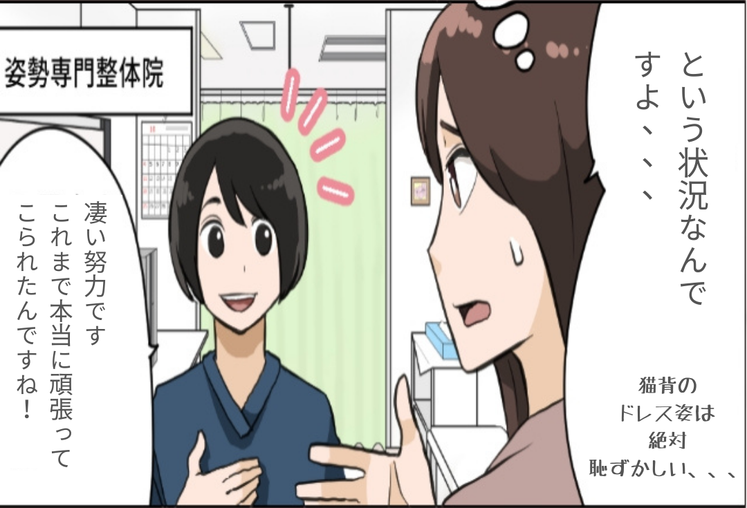 ストレートネックや巻き肩はウエディングドレスから見えてしまう部分なので、しっかり治してもらいました。