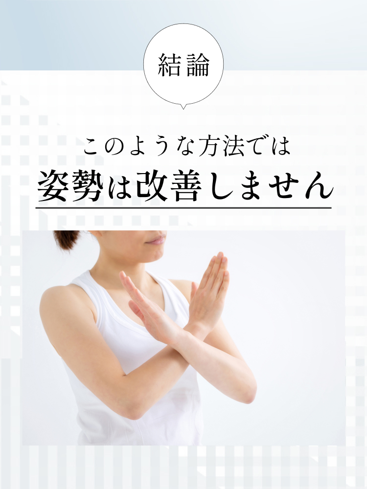 姿勢を治していくには運動療法を通して、普段の体の動かし方の癖自体を脳に再学習させていく事が重要です。