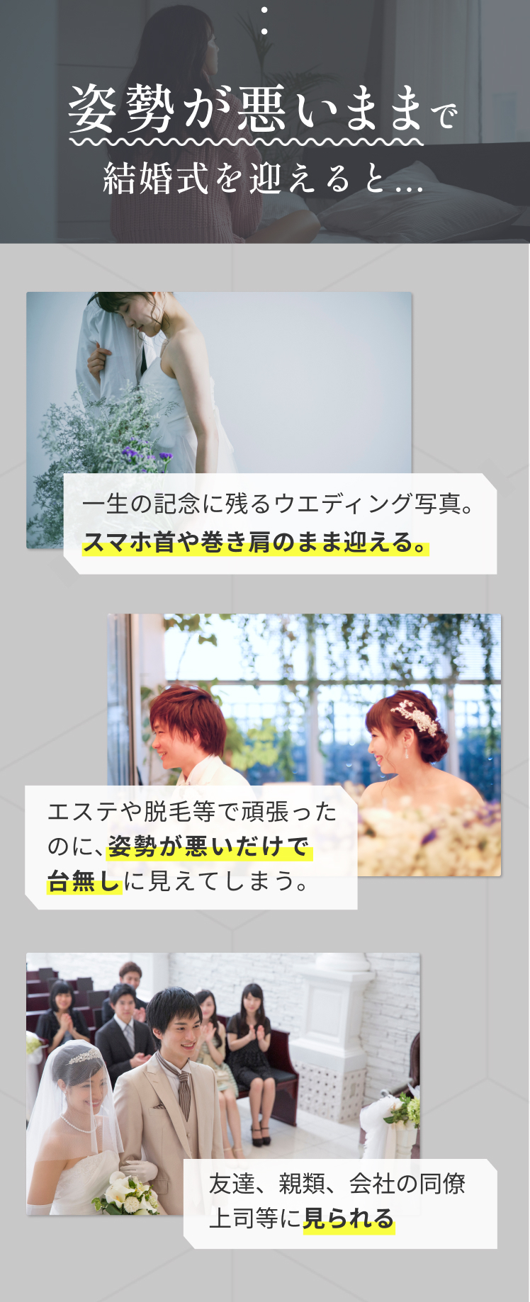 ウエディングドレスにストレートネックや巻き肩が目立つのは何としてでも避けたいですね。