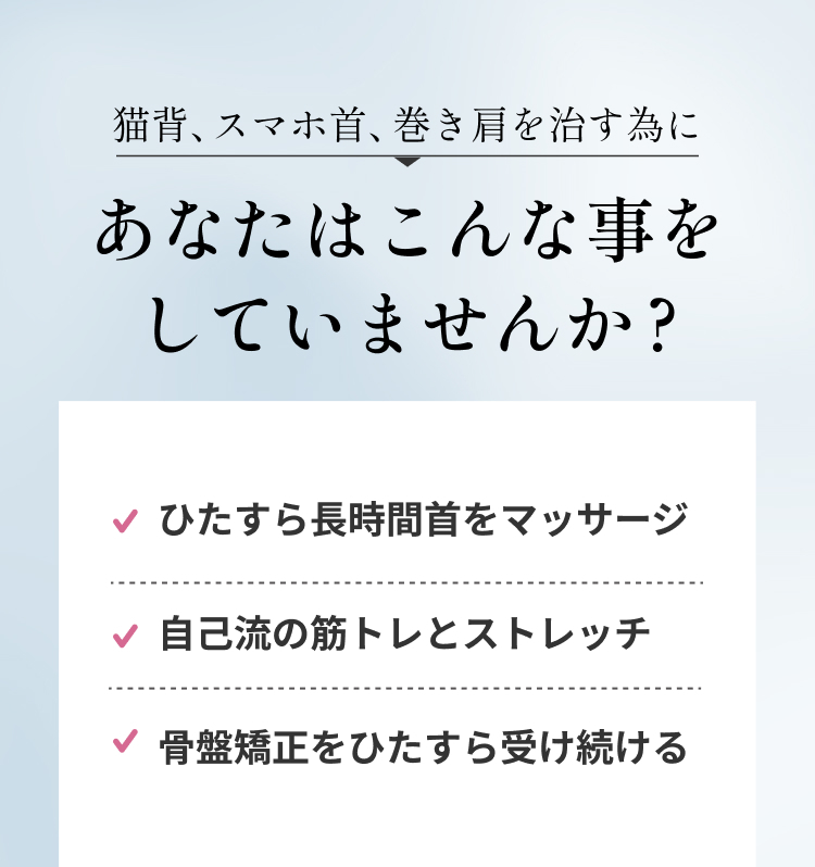 むやみやたらに、ひたすら揉むような施術を受け続けていると、原因が分からないままなので、「もみほぐす事で逆に姿勢が悪化してしまう筋肉」まで、知らず知らずのうちにほぐしてしまい、かえってストレートネックが悪化してしまったというケースも後を絶ちません。
