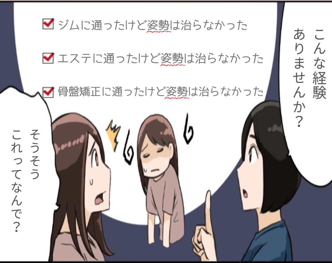 姿勢を根本的に矯正していく為には、寝て整体を受けるだけではすぐ元に戻ってしまいます。