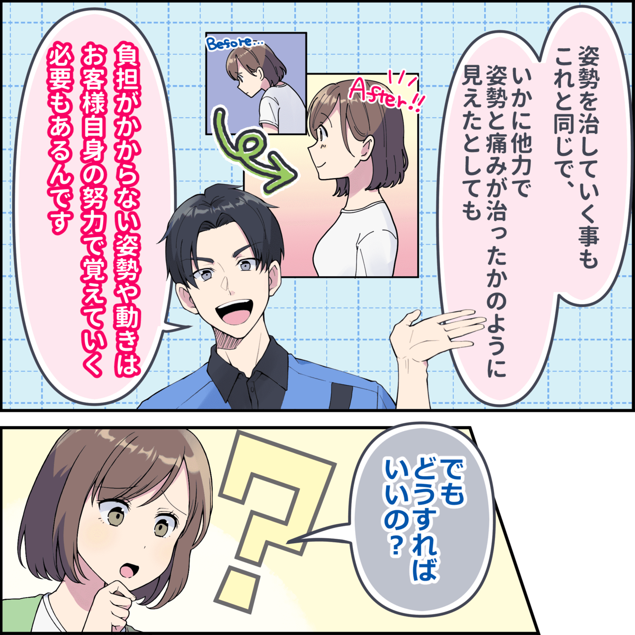 姿勢を根本的に矯正していく為には、寝て整体を受けるだけではすぐ元に戻ってしまいます。