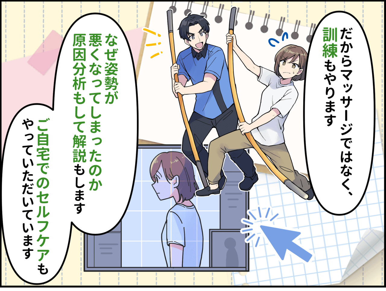 当院では、来店してすぐ体をもみほぐすといった施術は行っておりません。